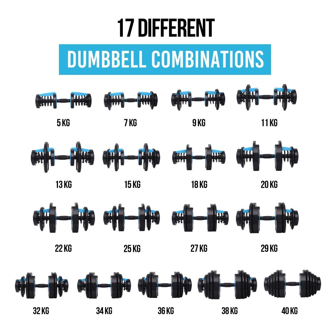 15 Different Dumbbell Combinations Easy-to-use selection dials to quickly and easily adjust weights ranging from 2.5kgs to 24kgs